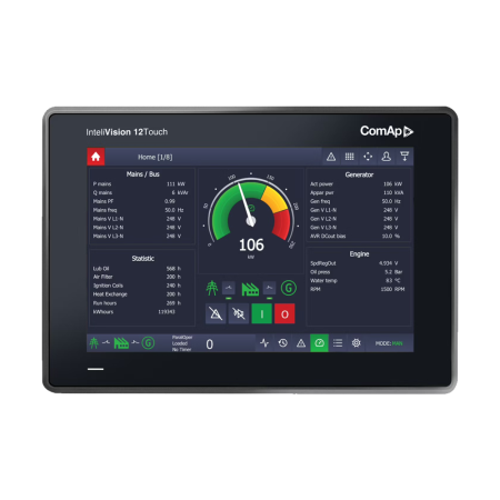 Intuitive, easy-to-use and simple to configure, the InteliVision 12Touch is an industrial operator panel equipped with 12.1” colour, multi-touch screen. Compatible with the majority of ComAp’s controllers, it provides comprehensive visual overview to monitor and control single gen-sets for various applications.